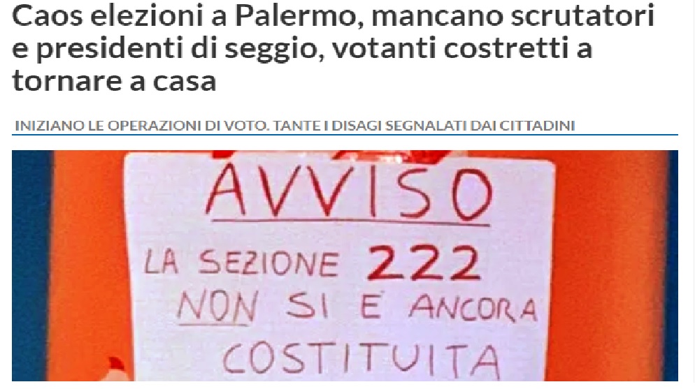 A Palermo oggi si dovrebbe votare per rinnovare le cariche politiche ed amministrative del capoluogo siciliano: seggi aperti, almeno sulla carta, dalle 7 alle 23. Poi, domani, ci sarà lo spoglio a partire dalle ore 14:00. Ma il condizionale è d’obbligo visto che, in diverse sezioni della città, mancano gli scrutatori e i presidenti di seggio. Personale senza il quale non si può nemmeno insediare il comitato elettorale, cosa che impedisce letteralmente ai cittadini di votare. Sono tante le segnalazioni di persone che, di fronte alla sezione chiusa, hanno girato i tacchi e sono tornate a casa. Il Comune sta provando a rimediare in corsa, insieme agli uffici e agli ordini professionali, ma le criticità rimangono.