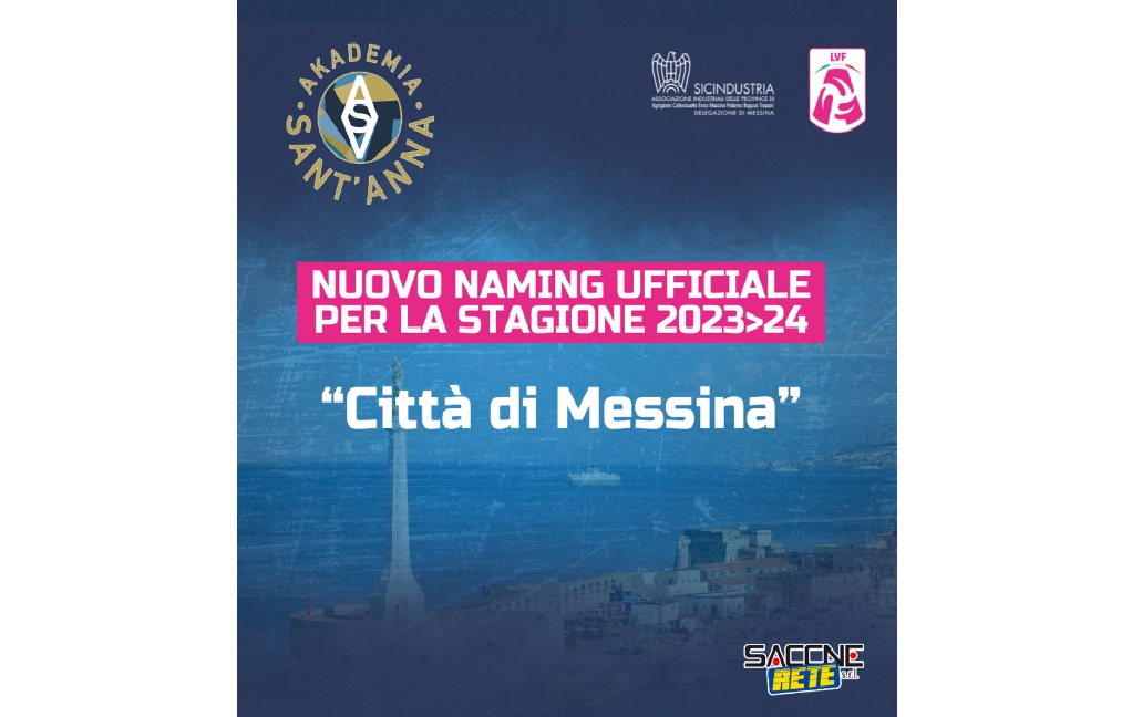 A pochi giorni dal torneo di Serie A2 2023/24, Akademia Sant’Anna ufficializza il cambio di denominazione, comunicando alla Lega Pallavolo Serie A Femminile il nuovo naming “Città di Messina”. Una decisione, quella del club messinese, maturata nell’ottica di rinsaldare il legame con il territorio, dando continuità al rapporto di piena collaborazione tra la società e l’Amministrazione Comunale e che risponde, inoltre, alla volontà di promuovere ulteriormente il brand Messina nel contesto nazionale, puntando in questo caso attraverso lo sport.