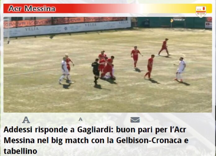 SECONDO TEMPO: Nessun cambio in avvio di ripresa e Aliperta prova subito a servire Foggia, ma il suo suggerimento è troppo lungo. Al 51’, cilentani molto pericolosi: imbucata di Uliano per Sparacello che prova la conclusione dal limite dell’area, ma Caruso si salva in corner. Tre minuti dopo, i padroni di casa passano: azione orchestrata sulla destra, cross di De Foglio in mezzo dove Gagliardi in semirovesciata mette in rete per l’1-0. I peloritani reagiscono a testa bassa impegnando in un paio di occasioni D’Agostino, ma sono ancora i campani a rendersi pericolosi con De Foglio. La squadra di mister Novelli prova a rimontare e va a un passo dal pari con Addessi, la cui conclusione viene respinta sulla linea da Onda, poi l’azione si ferma per un offside. Al 74’, Gelbison a un passo dal raddoppio, Uliano mette in mezzo per De Foglio che ci prova e chiama Caruso al grande intervento per mettere in corner. Due minuti più tardi, ecco il pari dell’Acr: bello scambio tra Cretella e Bollino con quest’ultimo che dopo una sponda di Foggia trova Addessi il quale dall’interno dell’area batte D’Agostino. A questo punto, girandola di sostituzioni e all’85’ il Messina sfiora il vantaggio con un tentativo di Addessi, ma D’Agostino salva i suoi. Tre minuti dopo, è la Gelbison a sfiorare il gol con una punizione dalla distanza di Uliano che si stampa sull’incrocio dei pali, poi Caruso sul prosieguo dell’azione anticipa Mesina. Durante i minuti di recupero, forcing dei padroni di casa, ma i messinesi si difendono con ordine e portano a casa un punto comunque pesante.