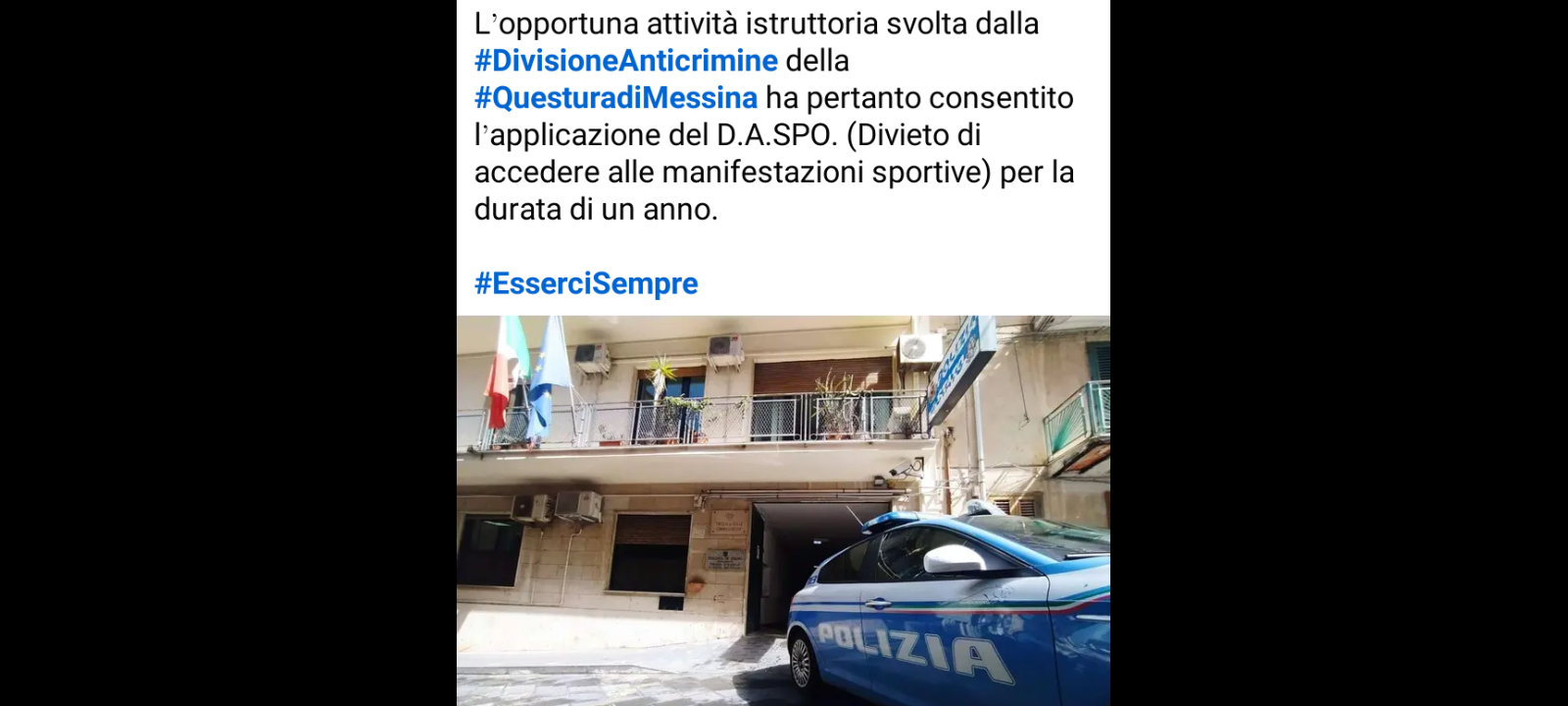 L’opportuna attività istruttoria svolta dalla #Divisione #Anticrimine della #Questura di Messina ha pertanto consentito l’applicazione del D.A.SPO. (Divieto di Accedere alle manifestazioni Sportive) per la durata di un anno.