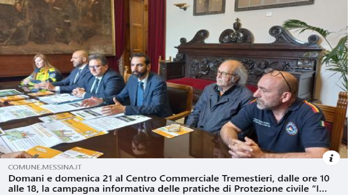 L’INIZIATIVA, PATROCINATA DAL COMUNE DI MESSINA, È PROMOSSA DAL DIPARTIMENTO DELLA PROTEZIONE CIVILE, IN COLLABORAZIONE CON ANPAS (ASSOCIAZIONE NAZIONALE PUBBLICHE ASSISTENZE), INGV (ISTITUTO NAZIONALE DI GEOFISICA E VULCANOLOGIA), RELUIS (RETE DEI LABORATORI UNIVERSITARI DI INGEGNERIA SISMICA), FONDAZIONE CIMA (CENTRO INTERNAZIONALE IN MONITORAGGIO AMBIENTALE), CONFERENZA DELLE REGIONI E DELLE PROVINCE AUTONOME E ANCI, L’ASSOCIAZIONE NAZIONALE COMUNI ITALIANI... LA CAMPAGNA INFORMATIVA SI TERRÀ DOMANI, SABATO 20, E DOMENICA 21 MAGGIO, DALLE ORE 10 SINO ALLE 18, AL CENTRO COMMERCIALE DI TREMESTIERI, DOVE VOLONTARIE E VOLONTARI DI PROTEZIONE CIVILE INVITANO LA CITTADINANZA A PARTECIPARE PER SCOPRIRE IL CONTRIBUTO CHE CIASCUNO DI NOI PUÒ DARE PER RIDURRE IL RISCHIO DEGLI INCENDI BOSCHIVI