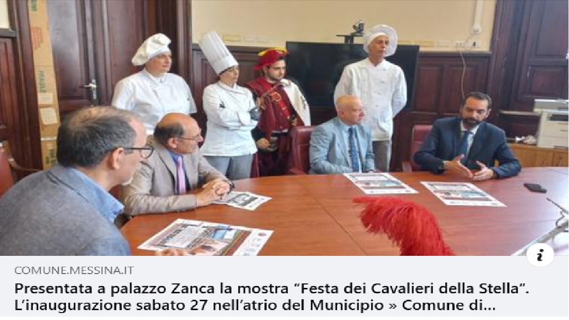 Alla presenza del sindaco Federico Basile e dell’assessore alla Cultura Enzo Caruso, stamani a palazzo Zanca, patrocinata dal Comune di Messina, è stata presentata la mostra intitolata “Festa dei Cavalieri della Stella”, che sarà inaugurata sabato 27, alle ore 19, nell’atrio del Palazzo municipale