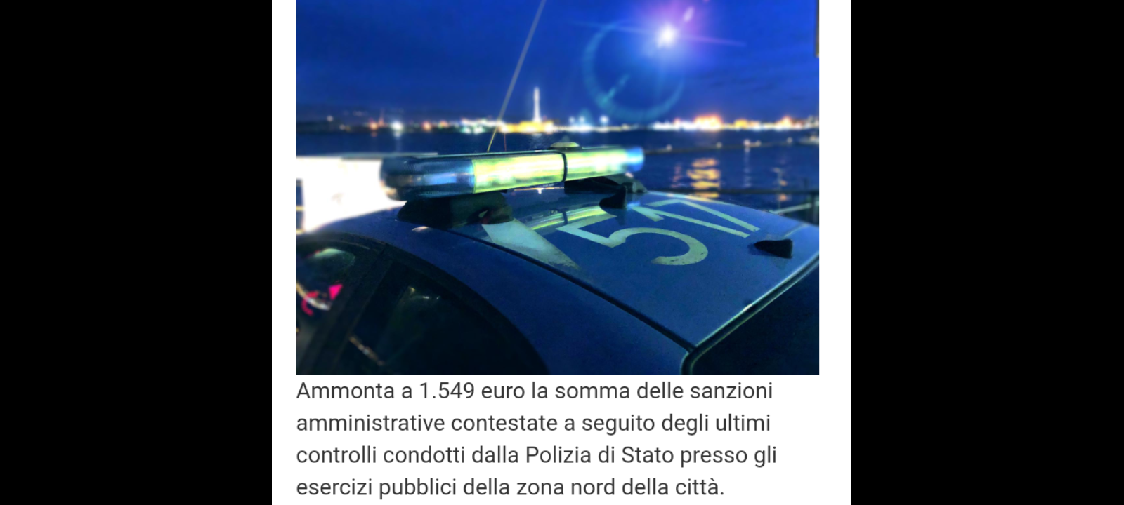 Ammonta a 1.549 euro la somma delle sanzioni amministrative contestate a seguito degli ultimi controlli condotti dalla Polizia di Stato presso gli esercizi pubblici della zona nord della città: prosegue, infatti, l’approfondita attività di verifica della Questura di Messina volta a garantire la sicurezza di avventori ed esercenti presso i luoghi maggiormente caratterizzati della movida estiva.