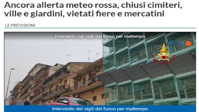 Ancora allerta meteo rossa nella Sicilia orientale a Catania, Siracusa, Ragusa e Messina passando per le isole minori, e allerta arancione nel resto dell’isola in particolare a Palermo. Il capoluogo etneo chiude cimiteri, ville e giardini e vieta ogni evento all’aperto…, stop a fiere e mercatini di ogni tipo della domenica… attivato anche un centro operativo d’emergenza.