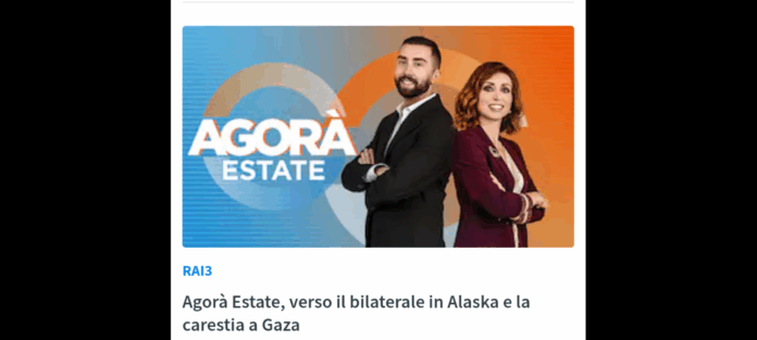 ‘Attesa per il vertice Trump-Putin in Alaska di Ferragosto. Zelensky: “è impossibile parlare dell’Ucraina senza l’Ucraina”; Ue e 24 Paesi denunciano la carestia a Gaza mentre Netanyahu va avanti con il progetto dell’occupazione; rintracciati in un campo rom alla periferia di Milano i quattro minorenni a bordo della vettura rubata che lunedì ha investito e ucciso la settantunenne Cecilia De Astis; poi l’intervista allo scrittore Flavio De Luca’. Questi alcuni dei temi della puntata di oggi, mercoledì 13 agosto, di Agorà Estate condotto da Giulia Di Stefano con Marco Carrara, che è iniziata in onda alle 8.00 su Rai3.