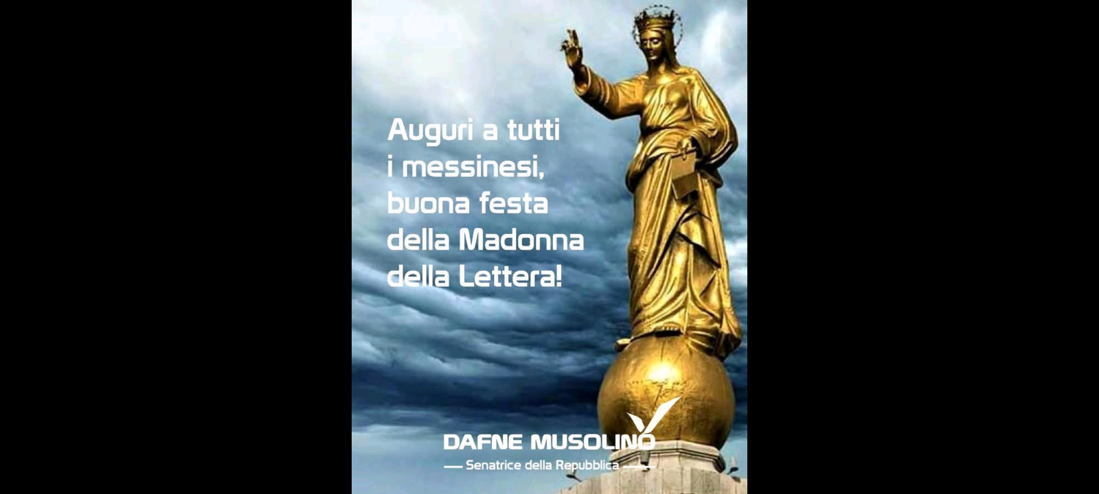 - ‘“O della Lettera Madre e Regina, salva Messina! Salva Messina!” sono i versi della preghiera che ogni anno i messinesi recitano rinnovando il loro voto di protezione alla Vergine Maria e affidando a Lei le loro speranze e i loro affanni. Oggi non potrò partecipare alle celebrazioni in onore della nostra Patrona Madonna della Lettera, perché sono impegnata nei lavori d’aula in Senato. Ma anche così so che ovunque e sempre la protezione della Madre mi segue e mi protegge. Auguri a tutti i messinesi, buona festa della Madonna della Lettera’!