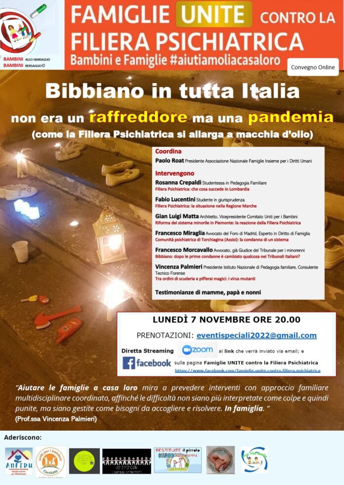 Bibbiano in tutta Italia: “Non era un raffreddore ma una pandemia, (come la Filiera Psichiatrica si allarga a macchia d’olio)”. E’ questo…, il titolo del Convegno on line, organizzato dai responsabili di ‘Famiglie UNITE contro la Filiera Psichiatrica’ ed ‘Associazione Nazionale Famiglie Insieme per i Diritti Umani’, che si terrà lunedì 7 novembre 2022 alle ore 20.00.