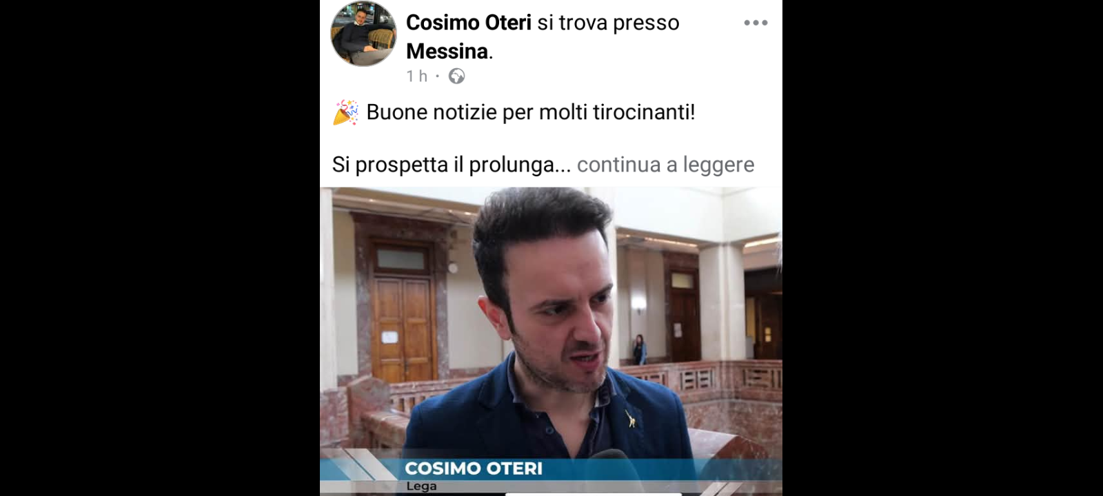 “Buone notizie per molti tirocinanti: Si prospetta il prolungamento del tirocinio d’inclusione previsto già fino ad agosto, a dicembre 2025, una conferma attesa da tanti”. Lo ha riferito ieri, sul suo omonimo Profilo Facebook… ‘Cosimo Oteri’, il consigliere comunale della Lega presso il Comune di Messina.