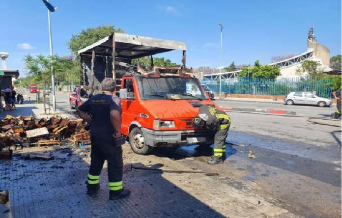 Camion in fiamme stamane davanti al mercato Vascone, il mezzo che è andato quasi completamente distrutto era solitamente adibito al trasporto della frutta ed al momento dell’incendio era carico di cassette di legno.