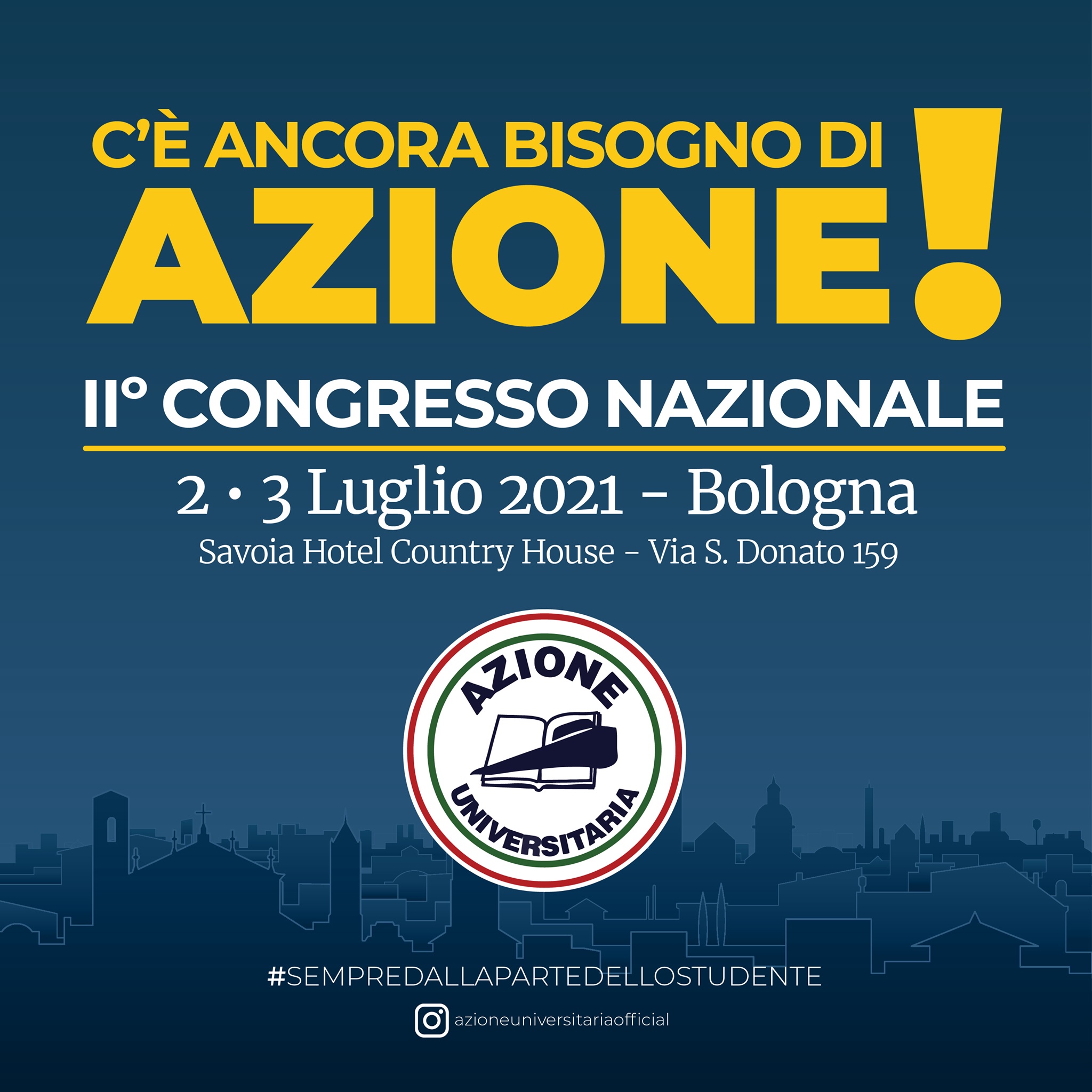 ”C’è ancora bisogno di Azione” è questo il titolo del secondo congresso Nazionale di Azione Universitaria, lo storico movimento della destra universitaria, che si terrà a Bologna domani venerdi 2 e sabato 3 luglio, presso il Savoia Hotel Country House Bologna, Via S. Donato, 159. Sarà una ‘due giorni’ di incontri e dibattiti dedicati alla ricerca e al futuro dell’università.