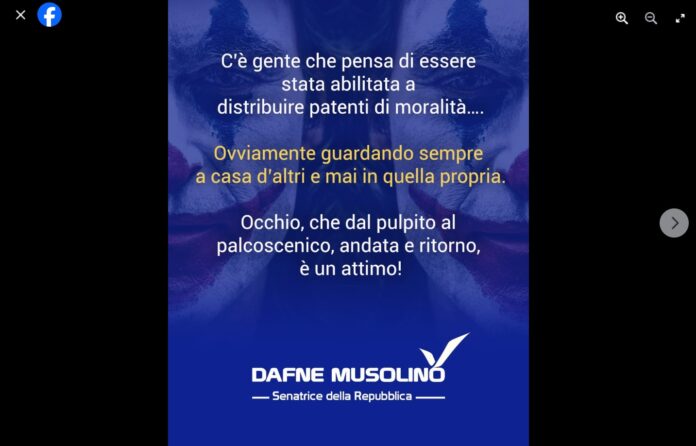 “C’è gente che pensa di essere stata abilitata a…, distribuire patenti di moralità…”! Così oggi 05 maggio 2024, si è espressa sulla sua omonima Pagina Facebook… Dafne Musolino avvocato e senatrice messinese del ‘Gruppo di Italia Viva’ presso Palazzo Madama a Roma.