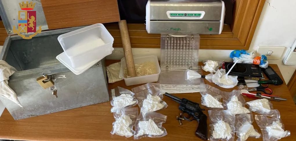 All’interno di un borsone nero gli agenti hanno rinvenuto 1 cassetta metallica chiusa con un lucchetto e relativa chiave: all’interno sono state sequestrate 13 buste in cellophane contenenti cocaina, 1 bilancino di precisione ed il revolver.