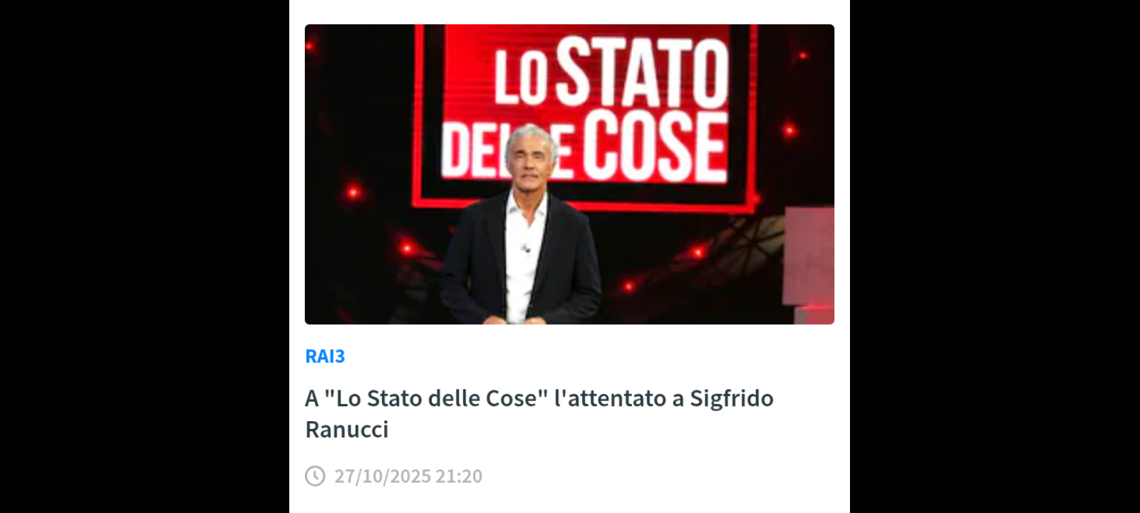 ‘Chi c’è dietro l’attentato al giornalista Sigfrido Ranucci? Parlerà un collaboratore di giustizia che con le sue rivelazioni ha reso possibili importanti operazioni contro la ‘ndrangheta; Aldo Cazzullo interverrà sui principali eventi della settimana e il leader di Azione Carlo Calenda e il direttore del Tempo Tommaso Cerno, si confronteranno sull’attualità politica italiana; l’inchiesta sul delitto di Garlasco continua con nuovi colpi di scena: Andrea Sempio è stato convocato dalla consulente della Procura di Pavia. Sul corpo di Sempio sono state eseguite alcune misurazioni che saranno messe a confronto con le ferite rinvenute sul corpo di Chiara Poggi: si sta andando verso una “riscrittura” della dinamica del delitto? In studio il confronto tra Antonio De Rensis, avvocato del condannato Stasi e Armando Palmegiani il nuovo consulente dell’indagato Sempio’. Questi i temi, dei quali si parlerà nella nuova puntata de “Lo Stato delle Cose” il programma di Massimo Giletti in onda lunedì 27 ottobre alle 21.20 su Rai3.