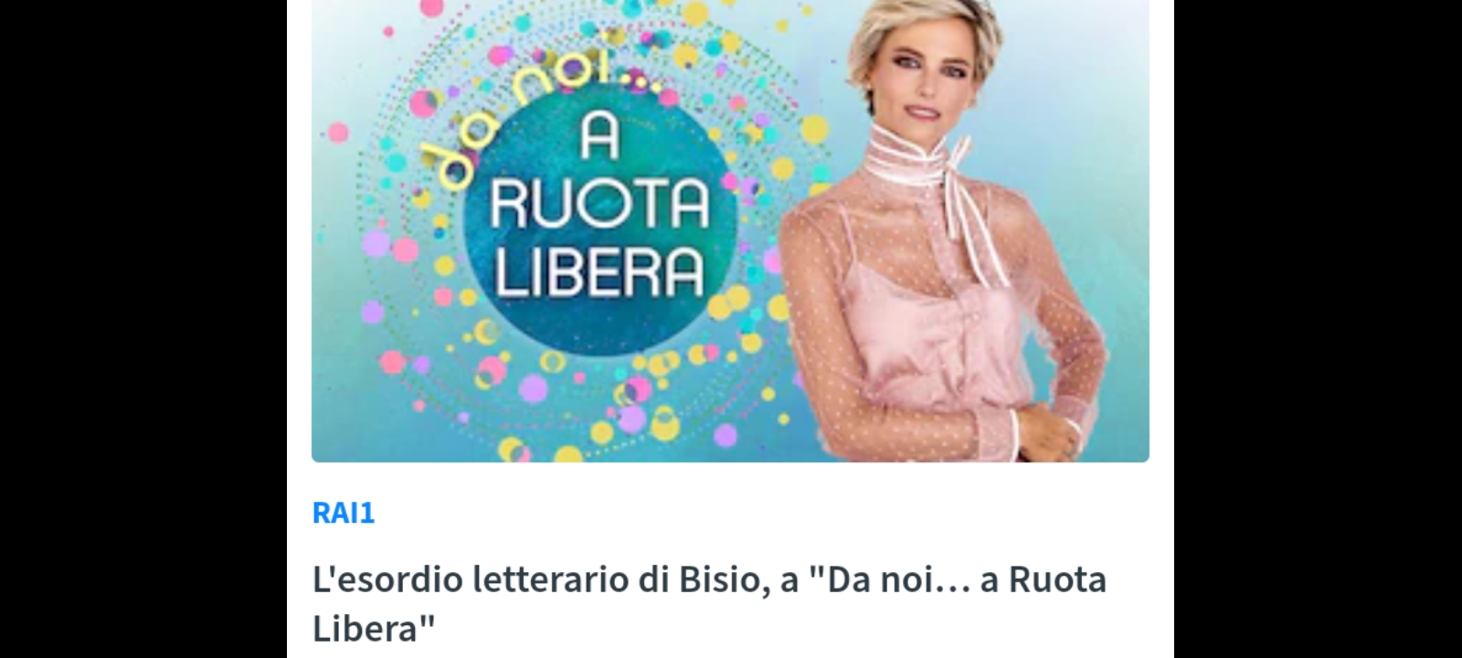 ‘Claudio Bisio e il suo primo romanzo, “Il talento degli scomparsi”; Alba Rohrwacher e Irene Maiorino, protagoniste nei panni di Lenù e Lila, della quarta e ultima stagione de “L’Amica Geniale”; Nina Zilli e Pasquale La Rocca, concorrenti di “Ballando con le Stelle”, costretti a ritirarsi a causa di un infortunio, ma che sperano nel ripescaggio; ospite poi, anche Massimo Manni, fondatore de “Il Santuario Capra Libera Tutti”, un luogo di accoglienza e cura per animali alle porte di Roma’. Sono gli ospiti della nuova puntata di “Da noi… a Ruota Libera”, il programma condotto da Francesca Fialdini, in onda domenica 10 novembre alle 17.20 su Rai1.