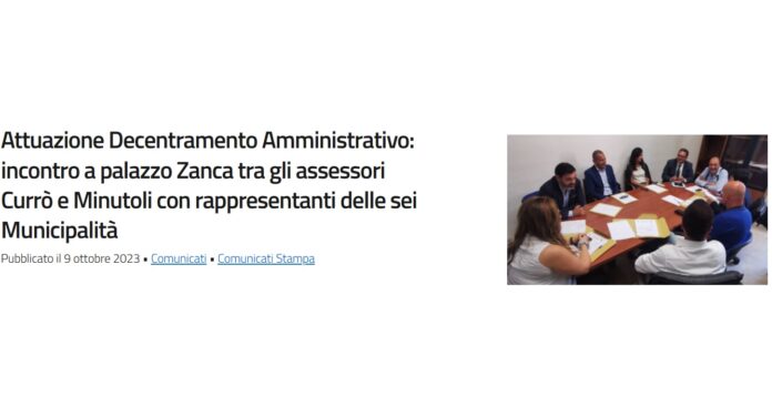 Con questo proposito oggi, lunedì 9 ottobre, convocato dall’assessore Pietro Currò nei locali del suo Assessorato a palazzo Zanca, presente l’assessore Massimiliano Minutoli, cui hanno preso parte anche il presidente della I Commissione consiliare Salvatore Papa e la dirigente del dipartimento Affari Generali Laura Strano, si è tenuto l’incontro con i rappresentanti delle sei Municipalità. Nell’ordine, hanno partecipato i presidenti della I, II e IV municipalità rispettivamente Alessandro Costa, Davide Siracusano e Matteo Grasso; con una delegazione di consiglieri circoscrizionali rappresentata dai consiglieri, Sebastian Romeo per la terza circoscrizione; Debora Buda per la quarta; Beatrice Belfiore, Andrea Zumbo e Giulio Fragale per la quinta; e Giovanni Francesco Russo e Massimo Costanzo per la sesta.