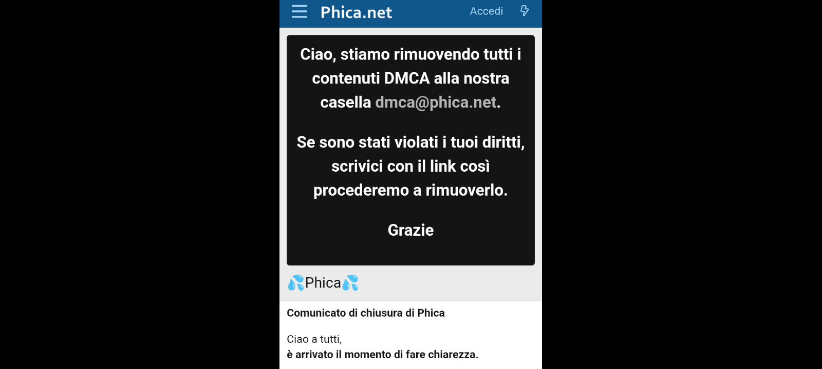- “Nonostante gli sforzi, non siamo riusciti a bloccare in tempo tutti quei comportamenti tossici che hanno spinto Phica a diventare, agli occhi di molti, un posto dal quale distanziarsi piuttosto che sentirsi orgogliosi di far parte. Per questo, con grande dispiacere, abbiamo deciso di chiudere e cancellare definitivamente tutto ciò che è stato fatto di sbagliato. Alcune precisazioni importanti”;