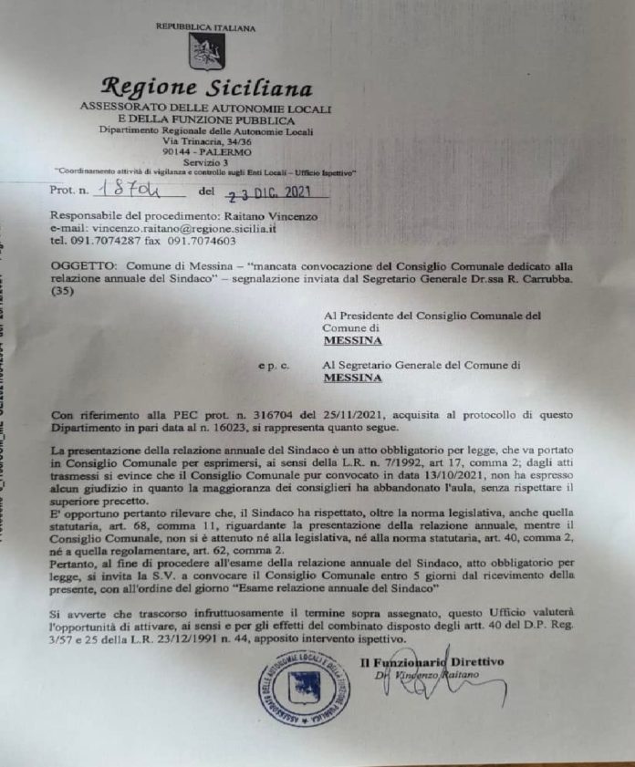 Ha aggiunto il massimo rappresentante politico dei messinesi: “per saperne di più…, stasera diretta FB alle ore 18:30 sulla pagina De Luca Sindaco di Messina con la partecipazione dei consiglieri comunali che amano Messina. Buona parte dei consiglieri comunali di Messina campa con i gettoni di presenza sulle spalle della comunità infatti le commissioni farlocche (in violazione del regolamento comunale) servono per questo. (Perché non mi querelate)! Il 23 dicembre scorso l’assessorato alle autonomie locali ha diffidato il presidente del consiglio comunale perché, per due volte, ha violato la legge che impone la discussione in consiglio comunale della relazione annuale dell’attività svolta dal sindaco. Ora sarà nominato un commissario perché entro ieri doveva essere discussa la relazione ma ciò non si è verificato”.