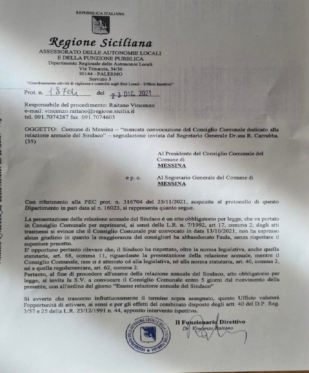 Ed ancora per concludere: “buona parte di queste relazioni sono dedicate al risanamento economico finanziario di cui il consiglio comunale non se ne è voluto occupare. Ora assistiamo al festival de morti di fame che gridano allo scandalo per le osservazione della corte dei conti sul nostro piano di riequilibrio economico finanziario. Buona parte dei consiglieri comunali da un lato per due anni non hanno mai voluto discutere questo argomento dall’altro si permettono di fare post e comunicati stampa chiedendo spiegazioni su degli argomenti che volutamente hanno ignorato. Abbiamo salvato la città dal fallimento ed il 10 gennaio invieremo le risposte ai dieci quesiti che sono stati formulati perché noi il nostro mestiere lo sappiamo svolgere senza se e senza ma…! Prosit. In allegato la nota la diffida dell’assessorato regionale autonomie locali”.