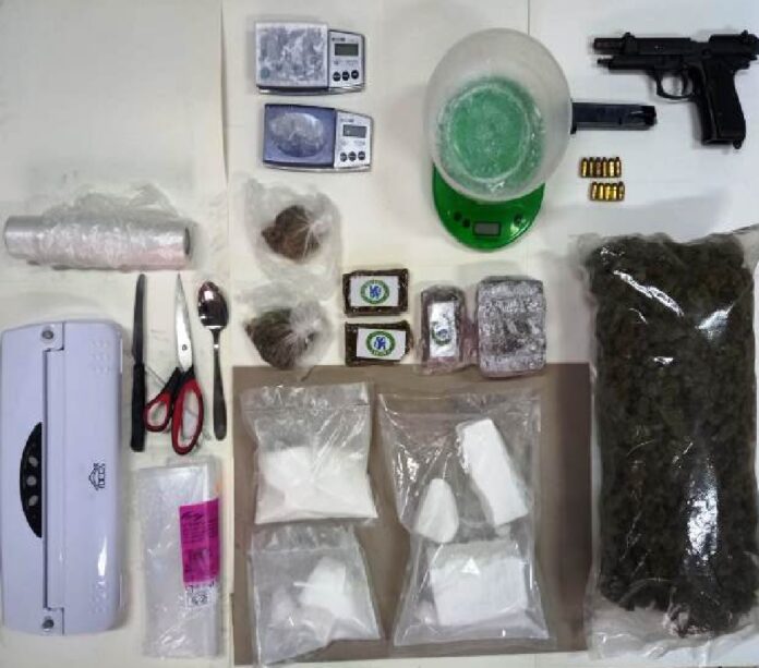 Nel pomeriggio della stessa giornata, proseguendo i servizi antidroga, gli agenti della Squadra Mobile, con la collaborazione del personale del Nucleo Cinofili Antidroga della Questura di Catania e del Reparto Prevenzione Crimine della Sicilia Orientale, hanno arrestato una donna di 52 anni, colta nella flagranza del reato di detenzione ai fini di spaccio di sostanze stupefacenti e detenzione di arma clandestina. In particolare, a seguito di perquisizione all’interno dell’abitazione della donna, nella stanza da letto, è stata rinvenuta cocaina in pezzi solidi, (1.076 grammi), marijuana (1.058 grammi), hascisc (824 grammi), materiale utilizzato per suddividere la droga in dosi, bilancini elettronici di precisione ed una macchinetta per effettuare il confezionamento sottovuoto.