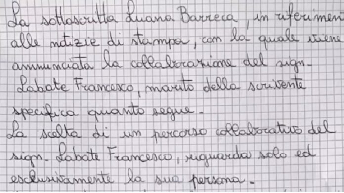 La donna, difesa dall’avvocato Lorenzo Gatto, lo fa sapere attraverso una lettera dattiloscritta, dove spiega che: «la scelta di un percorso collaborativo del signor Labate Francesco, riguarda solo ed esclusivamente la sua persona».