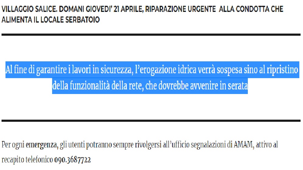Dalla mattina di domani, giovedi 21 aprile 2022, a Salice un villaggio collinare della zona Nord messinese, è prevista una interruzione idrica che comporterà l’assenza del prezioso liquido per l’intera giornata. Questo è comunicato, in una nota odierna diffusa dai responsabili dell’Amam.