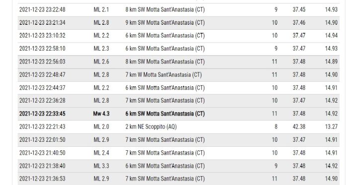 Dallo scorso 23 dicembre 2021 a ieri 24, in Provincia di Catania si sono registrate 21 scosse di terremoto che denotano un esistente ed intenso sciame sismico.