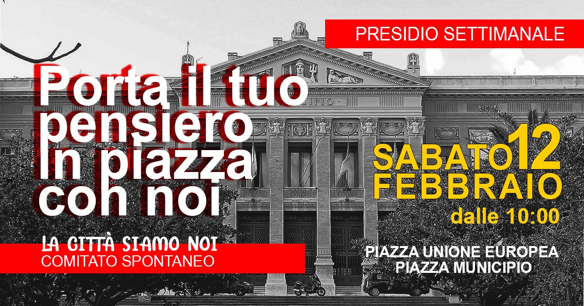 Così hanno proseguito gli aderenti a tale sodalizio: “quello che ci interessa è avere un sindaco che metta al centro gli interessi dei cittadini e delle cittadine e non i suoi. Nuovo appuntamento in piazza Municipio, sabato 12 febbraio, per contrastare la narrazione tossica del primo cittadino. Anche questa volta saremo lì con la nostra scatola dei -messaggi per il sindaco- per dare a tutti e a tutte la possibilità di esprimersi e di dire al primo cittadino che la città è stanca dei suoi modi e della sua arroganza”.