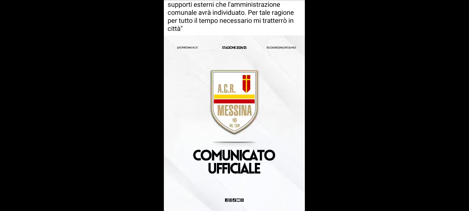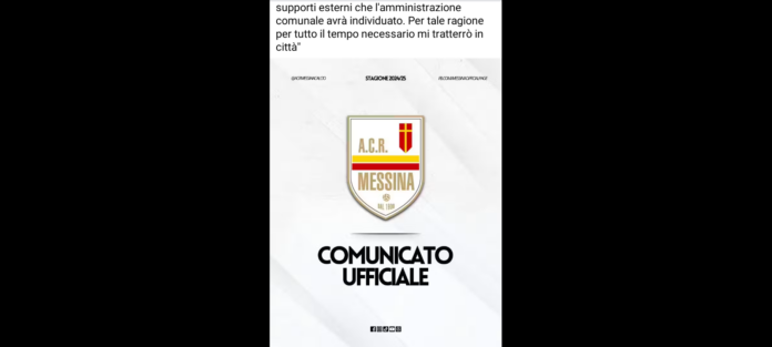 “Desidero informare tutti gli sportivi messinesi che ho appena consegnato ad un emissario del sindaco di Messina, l’originale cartaceo della procura a vendere rilasciata da ‘Aad Invest Group’: Già da domani mattina sono disponibile a stipulare, al prezzo simbolico di 1 euro, l’atto di vendita delle quote dell’Acr Messina al soggetto o ai soggetti che il primo cittadino mi indicherà”. Lo ha dichiarato in una nota diramata ieri, il presidente del sodalizio sportivo giallorosso… Stefano Alaimo.