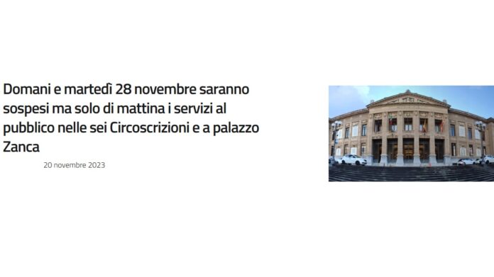 A palazzo Zanca saranno comunque garantiti, anche di mattina, il servizio carte di identità, le autentiche e i servizi essenziali di stato civile (ufficio morti). Di pomeriggio le attività saranno assicurate alla cittadinanza nei consueti orari dalle 14.30 alle 16.30 nelle seguenti sedi… ‘martedì pomeriggio, domani, martedì 21, e martedì 28 novembre, a palazzo Zanca tutti i servizi saranno aperti dalle 14.30 alle 16.30 e nelle Circoscrizioni seconda, terza e quinta, dalle 14.30 alle 16.30, apertura al pubblico, come di consueto’.