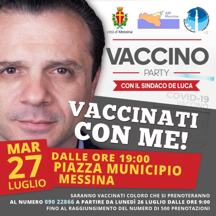 Domani, martedì 27, dalle ore 19 alle 24, a piazza Unione Europea, prenderà il via “Vaccino Party – Vaccinati con me”, l’open day promosso dal Sindaco Cateno de Luca per incentivare la campagna vaccinale Covid 19, di concerto con il Commissario ad acta per l’emergenza Covid, prof. Alberto Firenze e l’ASP di Messina. Pertanto, il Sindaco De Luca invita i cittadini che non hanno trovato il tempo o il coraggio di vaccinarsi di prenotarsi a partire da oggi, lunedì 26 al recapito telefonico 090 22866. Saranno accolte un numero massimo di 500 prenotazioni.