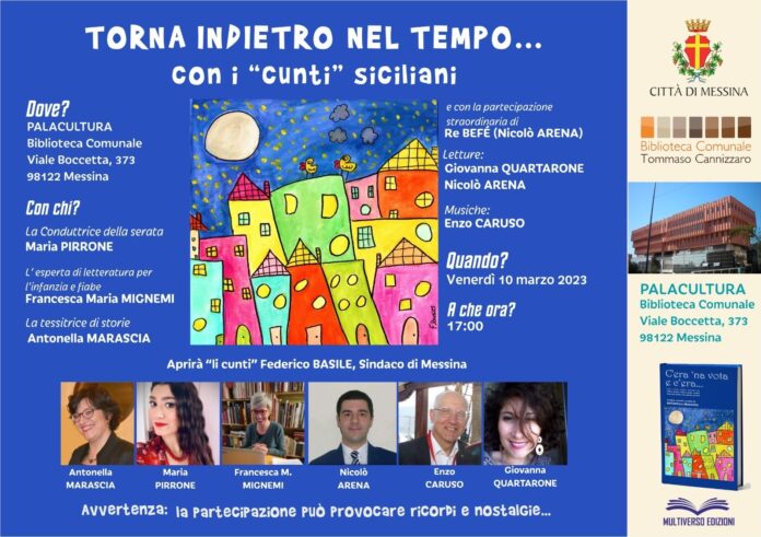 Domani, venerdì 10, alle ore 17, al Palacultura nella Sala Rari della Biblioteca comunale “Tommaso Cannizzaro”, alla presenza del Sindaco Federico Basile e dell’Assessore alle Politiche Culturali Enzo Caruso, si terrà l’evento “Torna indietro nel tempo…con i ‘cunti’ siciliani”.