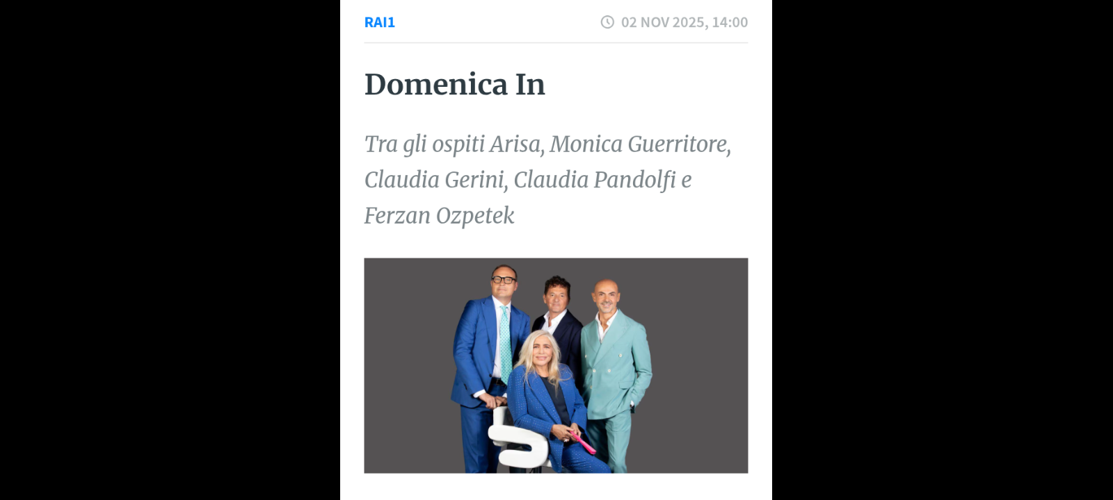 Domenica 2 novembre, è iniziato alle 14.00 e durerà fino alle 17.10 su Rai1, nuovo appuntamento con “Domenica In”, condotto da Mara Venier in compagnia di Tommaso Cerno, Teo Mammucari ed Enzo Miccio, in diretta dagli Studi “Fabrizio Frizzi” di Roma. Dalla musica al cinema, dall’attualità alla televisione, la settima puntata sarà ricca di ospiti.