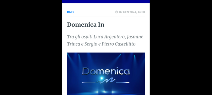 Domenica 7 gennaio, è iniziata alle ore 14.00 e durerà fino alle ore 17.10 su Rai1 e Rai Italia, in diretta dagli Studi ‘Fabrizio Frizzi’ di Roma, in onda la diciassettesima puntata della nuova edizione 2023/2024 di ‘Domenica In’ condotta da Mara Venier e che si aprirà con un talk che ripercorrerà la storia del ‘Festival di Sanremo.