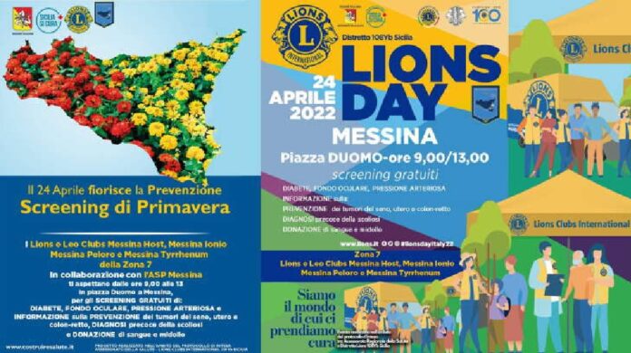 Domenica prossima 24 aprile dalle 9,00 alle 13,00 il Lions e Leo Club Messina Host, Messina Ionio, Messina Peloro e Messina Tyrrhenum promuoveranno in Piazza Duomo a Messina il Lions Day, un’importante iniziativa sociale che dedicata alla tutela della salute, alla prevenzione di alcuni tumori e di varie patologie che si svolgerà in tante città italiane.