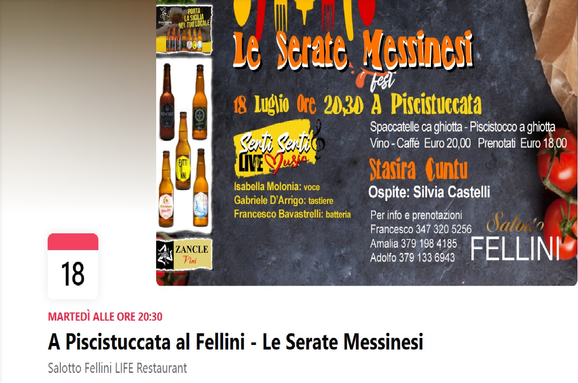 Fino alla fine di settembre, ogni martedì i piatti della tradizione saranno il lietmotiv delle serate Messinesi del Fellini. Si cenerà sotto il Campanile dall’orologio meccanico e astronomico più complesso al mondo con sottofondo musicale e il trascinante internezzo offerto dai «Senti Senti”. E sempre sulla scia della tradizione lo spazio “Stasira Cuntu” – gestito questa settimana da Silvia Castelli – porterà l’attenzione sulla sicilianità attraverso il fascino accattivante dei racconti popolari.