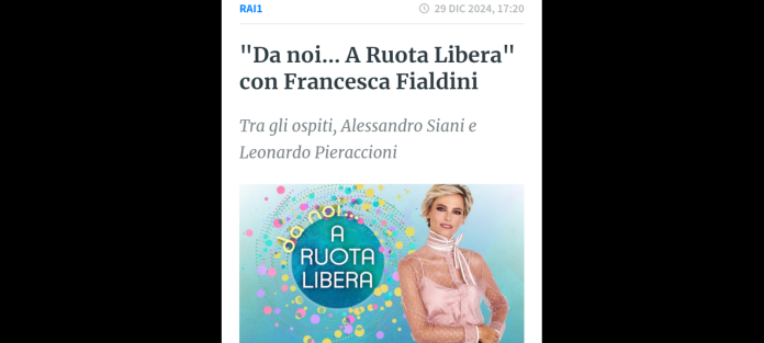 Dopo la pausa della scorsa settimana, domenica 29 dicembre alle 17.20 su Rai1 torna l’appuntamento con Francesca Fialdini e “Da noi… a Ruota Libera”, il programma realizzato dalla direzione Intrattenimento Day Time in collaborazione con Endemol Shine Italy.