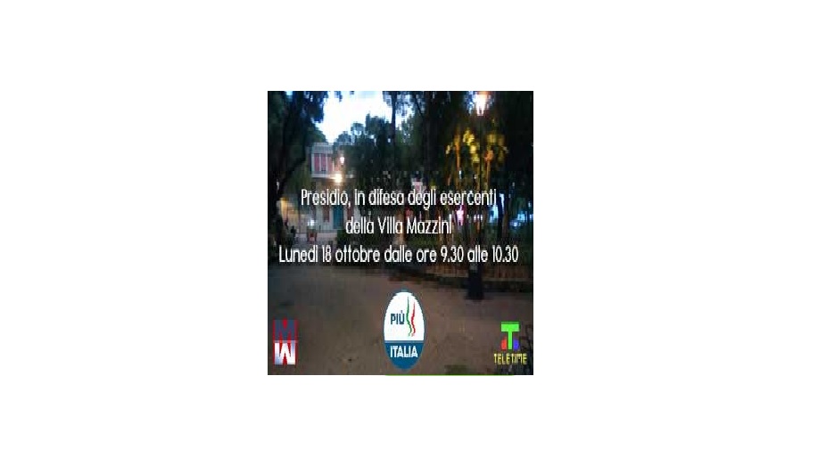 “Dopo la recente, comunicazione dell’assessore della Giunta (guidata dal sindaco di Messina Cateno De Luca), Dafne Musolino avvenuta in un filmato pubblicato dal quotidiano on line… www.tempostretto.it il 14 ottobre, i rappresentanti di Più Italia informano che lunedì 18 dalle ore 09:30 alle 10:30 si terrà un Presidio di solidarietà verso gli esercenti dei Chioschi situati nello spazio verde di viale Boccetta”. Lo rende noto, in una nota odierna, il coordinatore provinciale del Partito Nazionale Più Italia (con sede a Frosinone guidato dal leader Fabrizio Pignalberi) Filippo Pansera.