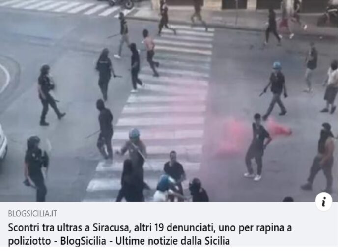 Dopo l’incontro di calcio, che si è tenuto mercoledì 4 ottobre scorso, tra il Siracusa e l’Acireale, si sono verificati, come è noto, alcuni episodi di violenze originati dalle intemperanze di sparuti gruppi di ultras delle due squadre che, con il pretesto dell’acerrima rivalità tra le due compagini calcistiche, per alcune ore, hanno impegnato le forze dell’ordine che hanno dovuto fronteggiare l’emergenza causata dagli pseudo tifosi. Nei giorni immediatamente successivi ai disordini, gli investigatori della DIGOS, con il prezioso contributo degli agenti della Polizia Scientifica aretusea, hanno individuato e denunciato all’Autorità Giudiziaria competente i primi 46 facinorosi…, oggi, sono stati denunciati altri 19 soggetti, anche loro accusati di essere stati protagonisti delle violenze del post partita.