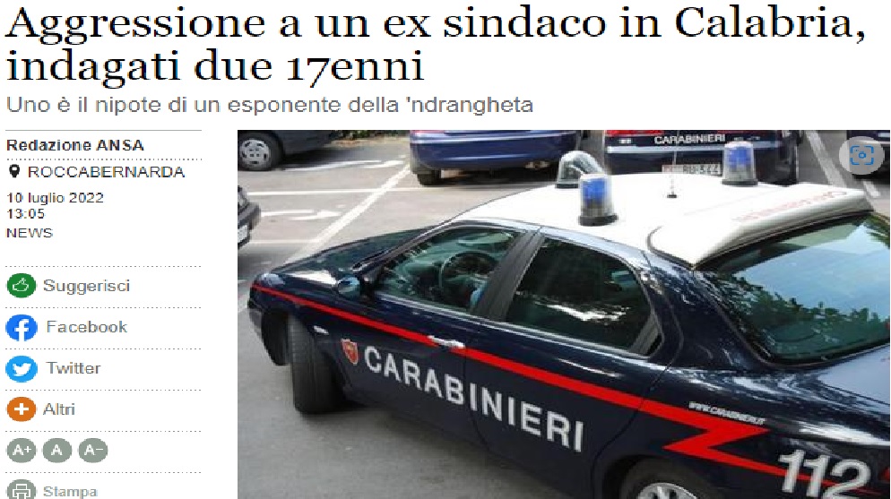 La posizione dei due minori, uno dei quali nipote di un esponente delle cosche locali, è al vaglio dei carabinieri della Compagnia di Petilia Policastro che, insieme ai militari del Reparto operativo – Nucleo investigativo di Crotone hanno avviato immediatamente le indagini per fare luce sull’accaduto con il coordinamento dei magistrati della Procura dei minorenni di Catanzaro.