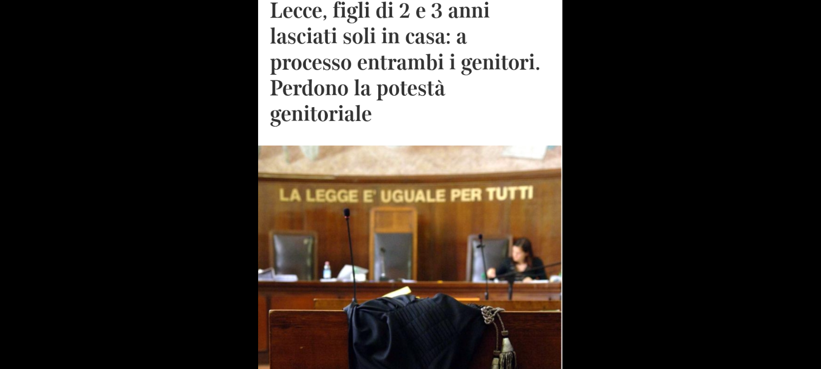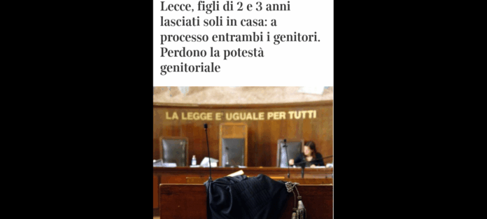 Due genitori di Lecce, un uomo di 38 anni e una donna di 25, sono finiti sotto processo per abbandono di minori aggravato per aver lasciato da soli in casa i loro due bambini di 2 e 3 anni ed essersi recati al supermercato a fare la spesa. I fatti risalgono al 3 novembre 2023… la coppia uscì di casa per circa due ore per la necessità di fare acquisti, lasciando i piccoli da soli in casa.