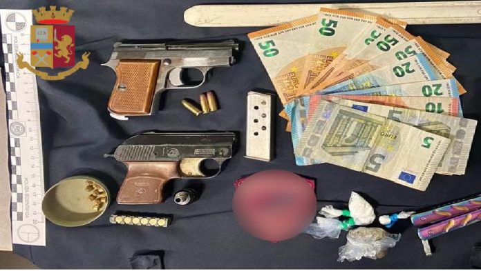 Gli agenti della Sezione Volanti e del commissariato Porta Pia, invece, hanno arrestato B. L. romano di 42 anni per detenzione e porto di arma clandestina, detenzione di arma comune da sparo e detenzione ai fini di spaccio di sostanza stupefacente. Durante l’attività di controllo del territorio, gli agenti hanno notato un’auto provenire da Via dell’Acqua Marcia a forte velocità e poi, alla loro vista, rallentare bruscamente per poi svoltare su Via Silvano. Fermato il veicolo per un controllo, il 42enne sin da subito ha manifestato un eccessivo stato di agitazione. La perquisizione personale ha permesso di rinvenire all’interno della tasca destra del giubbotto due coltelli, uno con manico in legno e lama sporca di sostanza stupefacente del tipo hashish e l’altro a farfalla, grigio cromato mentre all’interno del marsupio che aveva a tracolla, in una fodera bianca, è stata trovata una pistola semiautomatica cal. 6.35 con matricola abrasa e caricatore inserito rifornito con 3 proiettili dello stesso calibro, oltre a denaro contante pari a 390,00 euro.