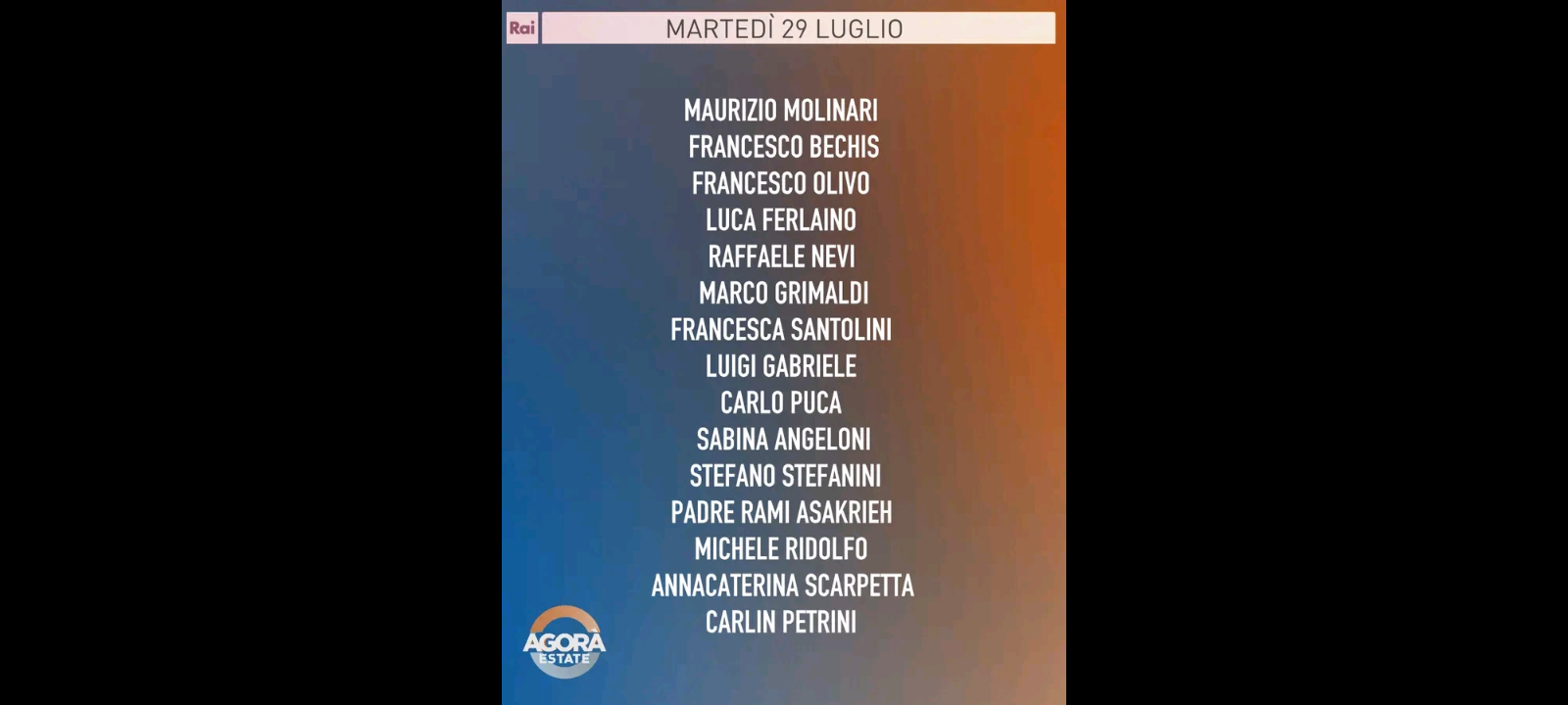 Ospiti: ‘Stefano Stefanini (Ispi); Maurizio Molinari (La Repubblica); Marco Grimaldi (Alleanza Verdi e Sinistra); Raffaele Nevi (Forza Italia); Francesco Olivo (La Vanguardia); Francesco Bechis (Il Messaggero); Luca Ferlaino (SocialCom); Michele Ridolfo (Wonderful Italy); Annacaterina Scarpetta (giornalista e globetrotter); Francesca Santolini (La Stampa); Luigi Gabriele (presidente Consumerismo); Carlo Puca (giornalista)’.