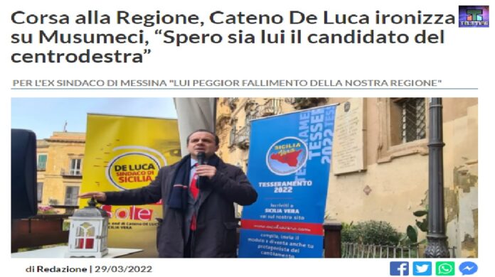 De Luca continua: “I dati che emergono dagli ultimi sondaggi indipendenti pubblicati che ci attribuiscono il 15% fanno emergere un quadro all’interno del quale Sicilia Vera occupa una posizione determinante nel panorama politico generale. È un dato che dimostra che la nostra piccola zattera, Sicilia Vera, ha un grado di riconoscibilità e gradimento che si identifica con Cateno De Luca sindaco di Sicilia. Il nostro progetto politico, sottolinea Cateno De Luca, è chiaro, alla luce del sole non uno slogan ma un valore”.