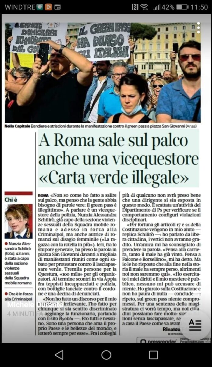 “È bello apprendere dai giornali, anziché dalla propria amministrazione, di essere già sotto procedimento disciplinare”. Lo ha scritto oggi sulla sua Pagina Facebook, il vice questore della Polizia di Stato Nunzia Alessandra Schillirò che ieri pomeriggio a Roma ha partecipato alla manifestazione contro il Green Pass.
