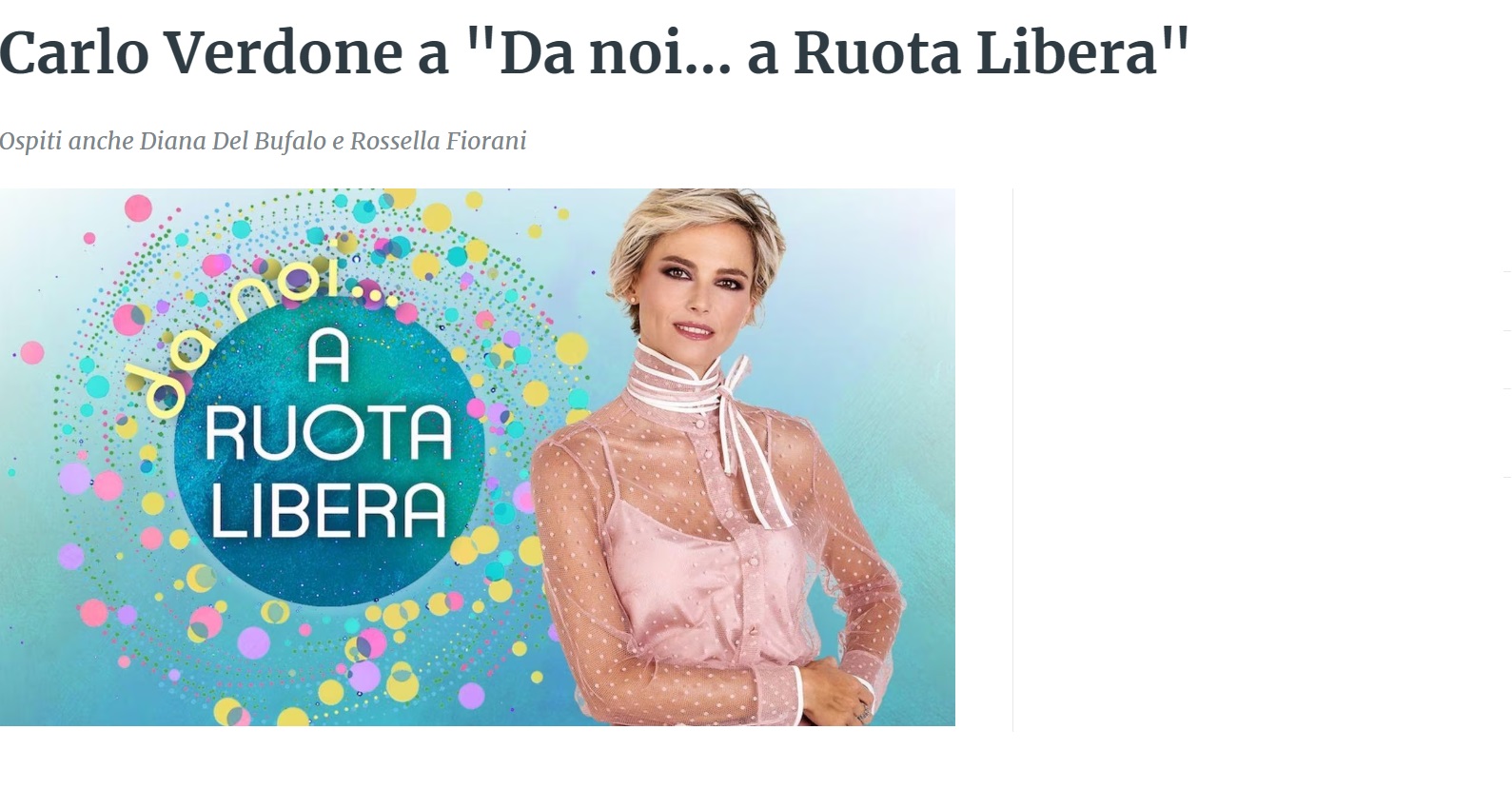 È Carlo Verdone l’ospite che apre il nuovo appuntamento con Francesca Fialdini e “Da noi… a Ruota Libera”, il programma realizzato dalla direzione Intrattenimento Day Time in collaborazione con Endemol Shine Italy, in onda domenica 14 aprile alle 17.20 su Rai 1.