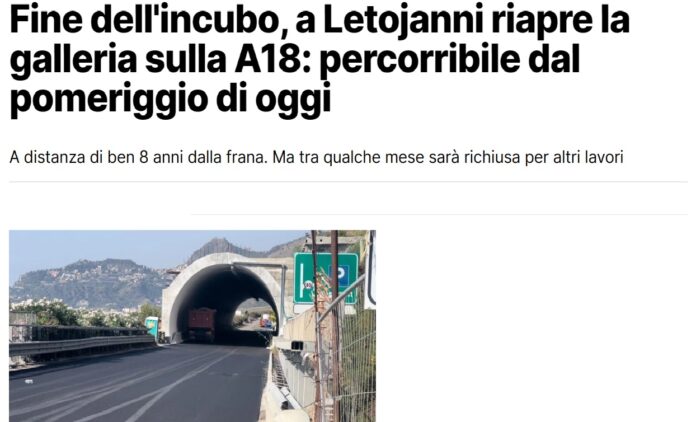 È il giorno della riapertura. Sono passati otto anni dal crollo, tre anni e mezzo da quando sono cominciati i lavori. Ritardi, sospensioni, varianti e adesso il primo traguardo raggiunto. Oggi pomeriggio alle 18 i mezzi torneranno a percorrere il tratto dell’autostrada Messina-Catania all’altezza di Letojanni, infilandosi nella galleria artificiale da 140 metri costruita ai piedi del costone da cui il 5 ottobre del 2015 la famosa frana tagliò in due la Sicilia a causa di 50.000 metri cubi di terra, roccia e arbusti che scivolarono sulla carreggiata in direzione Catania dalla collina di San Filippo.