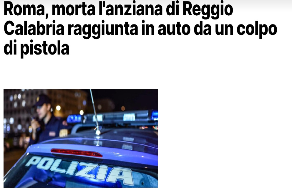 È morta l’anziana centrata da un colpo di pistola mentre era in auto con un’amica ieri pomeriggio alla periferia di Roma: la polizia ha trovato cinque bossoli a terra… l’ipotesi è che siano stati esplosi da una stessa pistola… è caccia a chi si trovava a bordo dell’auto rossa da cui sono partiti i colpi… la pista più accreditata è che l’81enne sia stata colpita per errore dal proiettile. È accaduto all’incrocio tra via Prenestina e via della Riserva Nuova… a rimanere in un primo momento ferita una 81enne originaria di Reggio Calabria che è stata trasportata in ospedale in gravi condizioni e sarebbe in pericolo di vita.