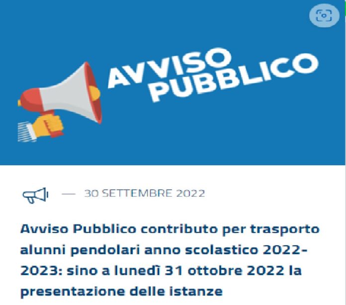 È pubblicato all’Albo Pretorio del Comune ed è consultabile sul sito istituzionale alla Sezione Informazioni l’Avviso Pubblico relativo al contributo per il trasporto di alunni pendolari per l’anno scolastico 2022-2023. Possono accedere al beneficio gli alunni delle scuole secondarie di II grado, residenti nel Comune di Messina, che utilizzano un mezzo pubblico di trasporto per frequentare un’istituzione scolastica secondaria di II grado (statale o paritaria), il cui indirizzo scolastico non è presente nel Comune di Messina.