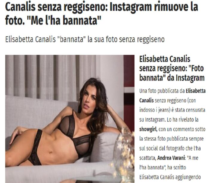 Una foto pubblicata da Elisabetta Canalis senza reggiseno (con indosso i jeans) è stata censurata su Instagram. Lo ha rivelato la showgirl, con un commento sotto la stessa foto pubblicata sempre sul social dal fotografo che l’ha scattata, Andrea Varani: “A me l’ha bannata”, ha scritto Elisabetta Canalis aggiungendo una emoticon che ride.