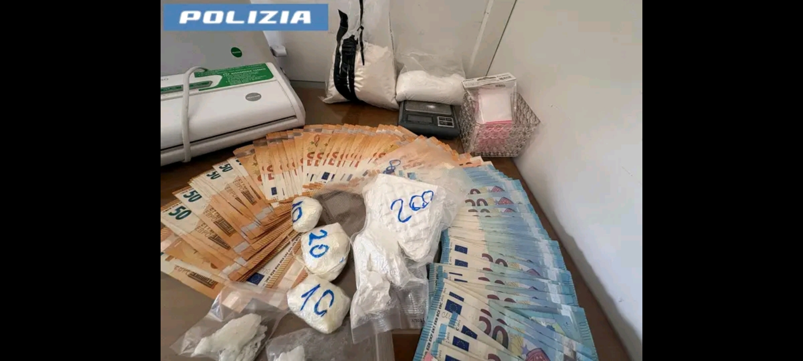 Nel corso della perquisizione sono stati sequestrati anche due telefoni cellulari criptati dal pusher, verosimilmente utilizzati per la gestione delle vendite ed il coordinamento delle consegne, a loro volta debitamente annotate in un libro mastro, compilato a mano con nomi in codice, quantità vendute e crediti da riscuotere. Pagine e pagine di importi con “partite” anche di diverse decine di migliaia di euro hanno confermato l’elevato volume d’affari gestito dal pusher. Una parte del presumibile provento è stata trovata in un cassetto, da cui sono “spuntati”, suddivisi in banconote di diverso taglio, 5.000 euro in contanti.